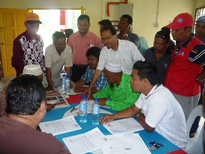 Sdr Mohd Nashruddin Abd Aziz (gambar berbaju putih-tengah), Penyelaras DUN Batang Kali memerangkap Ketua Bahagian Hulu Selangor bersama AJK JKKK Kg Sg Buaya membantu peneroka-peneroka menjawab soalan berkenaan tawaran dari kerajaan negeri.